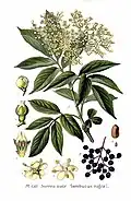 | Bez černý (kozenka, bezinky, psí bez, smradlavý bez) | květy, čerstvé listy a květy, kůra, čerstvé květy[5] | Flores sambuci, Sambucus nigra, Sabmucus e cortice, Sambucus e floribus[5] | při kurdějích (avitaminóze vitaminu C), potopudné, silné projímavé – (začerstva), silné diuretické, analgetické[5]