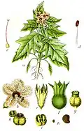 | Blín černý (blejn, ďáblovo oko, furgácie, kapří květ, sviní bob arkadský, telian, žbánečky...) | list, kvetoucí nať, semena | Folium hyoscyami,oficiální v ČsL2 Herba hyoscyami, Semen hyoscyami[3] | antiastmatikum, spasmolytikum [3] |