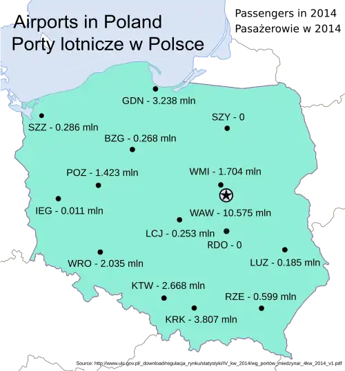 - ↑ Liczba obsłużonych pasażerów oraz wykonanych operacji w ruchu krajowym i międzynarodowym - regularnym i czarterowym w latach 2011 - 2013 [online]. Urząd Lotnictwa Cywilnego [cit. 2012-03-19]. Dostupné online. (polsky)