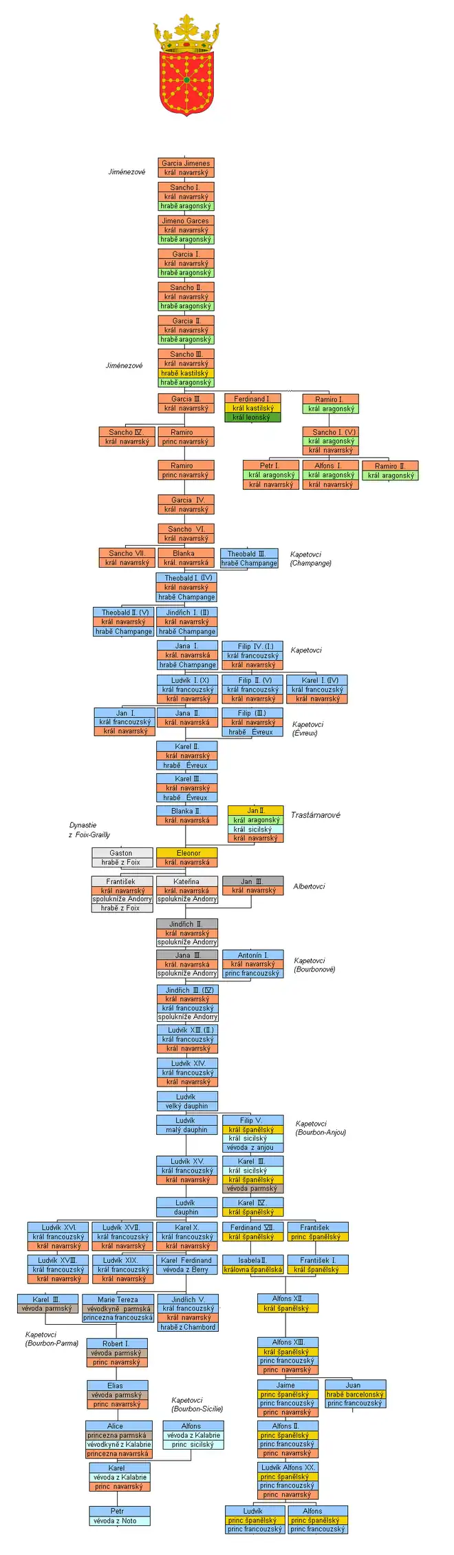 2. Navarrské království a další nezávislá území (Bearn, atd..) pod vládou Francouzského krále byla roku 1620 trvale spojena s francouzskou korunou a dnes jsou součástí Francie, od té doby tyto bývalé země a především Navarra nemají autonomii či nezávislou vládu. Po vymření hlavní linie Bourbonů v roce 1883 Jindřichem V., přešel nárok na francouzský trůn na španělskou větev Bourbonů (Bourbon-Anjou), ale není jasné zda spolu s ním přešel také nárok na navarrský trůn nebo podle primogenitury přešel na potomky Marie Terezy, starší sestry Jindřicha V.