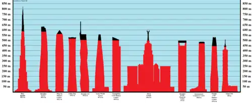 | World Trade Center 1 | New York | 417 m | 110 | 1972 | 2001 | Zničeny při teroristických útocích 11. září 2001. | |