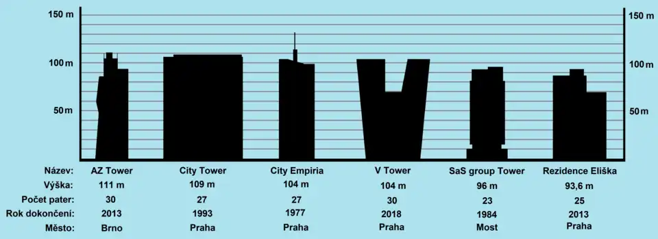 Výškové porovnání šesti nejvyšších kancelářských a obytných budov v ČR.