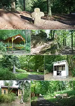 - ↑ Vyhlídky, altány, chaty, kříže, památníky, studánky, památné stromy… – Kniha [online]. Lázeňské lesy Karlovy Vary (organizace), oficiální stránky příspěvkové organizace [cit. 2020-03-10]. Dostupné v archivu pořízeném dne 2019-06-24.