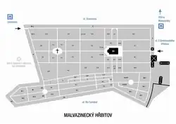 - ↑ a b c d e f g h i j k l m n o p q r s t u v Historie Malvazineckého hřbitova popsaná na veřejně přístupné nástěnce u hlavního vchodu do hřbitova. (Popis platný k datu: 16. května 2023)
