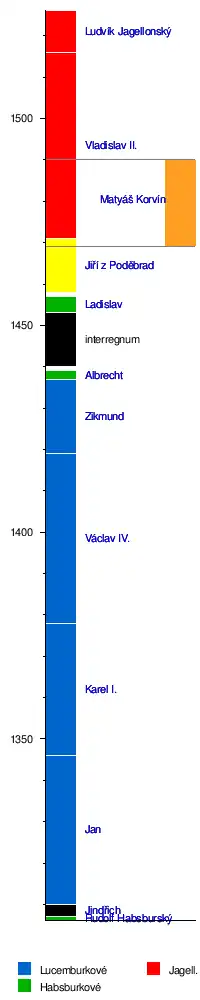 Matyáš KorvínLudvík JagellonskýVladislav JagellonskýJiří z PoděbradLadislav PohrobekAlbrecht II. HabsburskýZikmund LucemburskýVáclav IV.Karel IV.Jan LucemburskýJindřich KorutanskýRudolf Habsburský