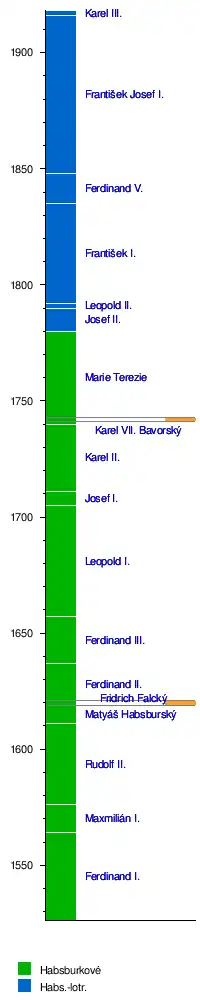 Karel VII. BavorskýFridrich FalckýKarel I.František Josef I.Ferdinand I. DobrotivýFrantišek I.Leopold II.Josef II.Marie TerezieKarel VI.Josef I. HabsburskýLeopold I.Ferdinand III. HabsburskýFerdinand II. ŠtýrskýMatyáš HabsburskýRudolf II.Maxmilián II. HabsburskýFerdinand I. Habsburský