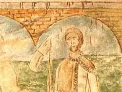 Rotunda sv. Kateřiny ve Znojmě. Fresky uvnitř rotundy nepřímo dokládají dynastickou posloupnost nejstarších českých vládců.