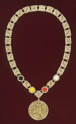 Pozlacený starostenský řetěz s touškovskou pečetí. Městské barvy symbolizují vlajku Města Touškova.