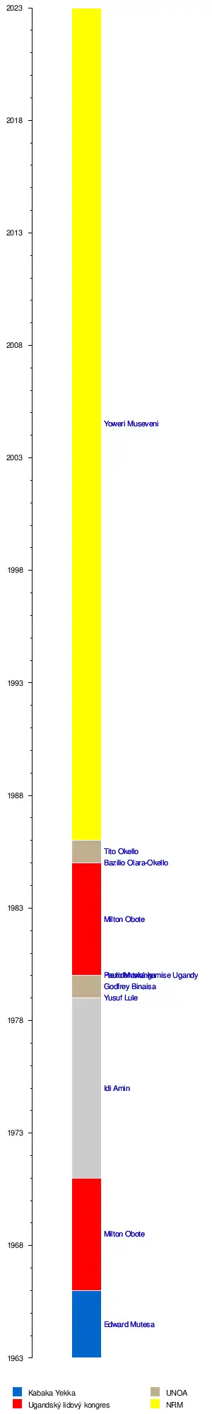 Od nezávislosti Ugandy v roce 1962 až po současnost měla Uganda různé hlavy států. Od roku 1962 do roku 1963 byla hlavou státu podle ústavy z roku 1962 královna Spojeného království Alžběta II. Královnu v Ugandě zastupoval generální guvernér. Uganda se stala republikou v rámci Commonwealthu na základě ústavního dodatku z roku 1963 a panovníka a generálního guvernéra nahradil obřadní prezident, kterého v roce 1966 nahradilo výkonné předsednictvo.