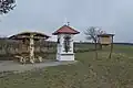 Kamenný kříž v areálu hřbitova, který byl obcí postaven v roce 1906 na místě původního dřevěného kříže.[3] Na přední straně je nápis: „Já jsem vzkříšeni a život, kdo věří ve mne byť také umřel, živ bude.“ Na kříži je litinový korpus Krista a reliéf Panny Marie.
