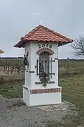 Kamenný kříž stojící asi 200 metrů od kraje obce poblíž cesty do Miroslavi v místech ústění polní cesty vedoucí od východu. Tělo Krista je litinové. Ve spodní části je z přední strany nápis: „Pochválen buď Ježíš Kristus — o — Ejhle Ježíš spanilý, jejž tvé hříchy zranily. Následuj Ho duše má, On tvá spása jediná“, a ze zadní strany pouze fragment začínající: „Věnován ku cti a chvále Boží...“. Jedná se nejspíše o písemně doložený kříž z roku 1905, který byl financován obecní sbírkou, postaven na místě zničeného dřevěného kříže a vysvěcen 29. října 1905.[3]