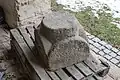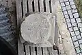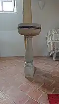 Pískovcový kámen opracovaný do krychlové hlavice s náběhem na válcový dřík, výška asi 35 cm.[2] Podle Bohumila Samka jde nejspíše o podstavec románské křtitelnice, zřejmě z nejranější doby existence kostela.[2][9] Delší dobu se kámen nacházel poblíž kostela u cesty k zámku, během úprav parku roku 2011 byl přesunut do zámku.[10] Objekt byl roku 1971 zapsán do seznamu kulturních památek pod evidenčním číslem 6572 památkářkou Alenou Foltýnovou (Horynovou), která hlavici datovala do první poloviny 17. století.[11]