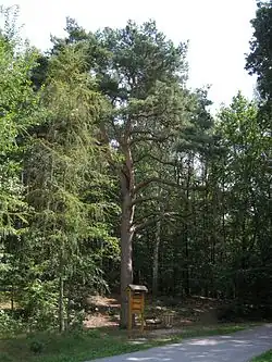 19 metrů vysoká borovice roste na okraji lesního pozemku v blízkosti rybích sádek u rybníka Košináře. | |