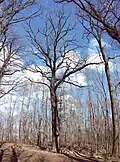 Hraniční strom mezi okresy Beroun a Praha-západ, na okraji lesa a pole. V roce 2003 starý rozložitý strom, u paty stromu (při pohledu od pole vpravo) poškození kůry, rána vykazuje napadení dřevokaznými houbami. Kosterní větve z velké části proschlé nebo zcela suché. V roce 2016 prosychání koruny od roku 2007 dramaticky nepostupuje, proschlé části koruny odvrácené od cesty, rána při bázi kmene lemována kalusem, dřevo v ní trouchniví, stopy po výskytu hmyzu, centrální dutina. | |