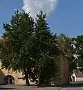 Roste u kamenné zdi zahrady domu čp. 29 na Masarykově nám. V roce 2004 na kmeni bez výraznějších poškození, v koruně suché větve jen ojediněle, kmen v dolní partii vyvětven do 7 metrů, zdravotní stav dobrý. | |