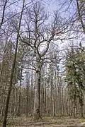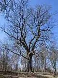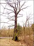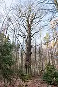Na okraji lesa u Hřebečnické Lesárny. Rozsáhlá kmenová dutina ve které byly v minulosti neodborným zásahem vyřezány adventivní kořeny. Jedna z hlavních kosterních větví byla v minulosti odlomena. Dutina kmene je vzdušná. | |