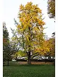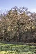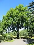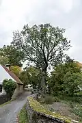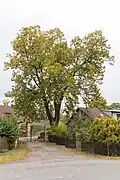 Roste severozápadně od kostela na hranici travnaté plochy a soukromé zahrady. | ||