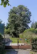 27 metrů vysoká lípa v zahradě blízko kamenného tarasu, který ji odděluje od příjezdové cesty ze Závišína. |