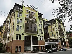 Šest soch na atice hotelu Butterfly | Mariánské Lázně Hlavní třída 655/72 49°58′8,13″ s. š., 12°42′7,69″ v. d. |