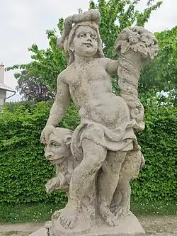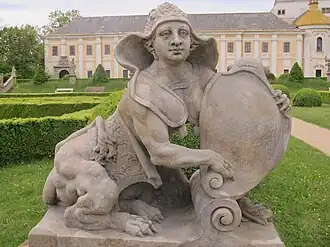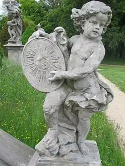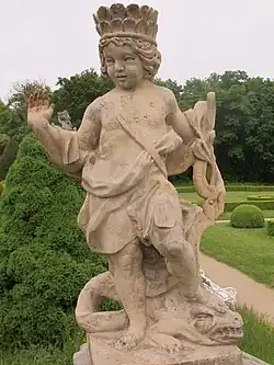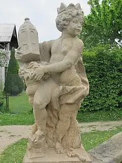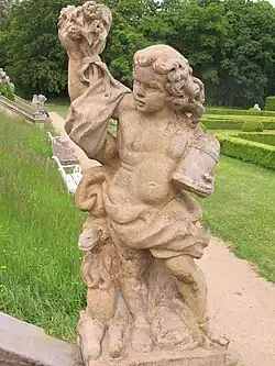 | Alegorická socha putti Gramatika – Literatura | dočasný deposit, dříve u severovýchodního nároží zámku | dílna Ignáce Františka Platzera | po roce 1764 | Pozdní baroko, Klasicismus | jemnozrnný pískovec |