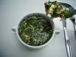 Polévka z domácích nudlí, nudle jsou smíchány s pohankou, bramborami, batáty a ssukem. |