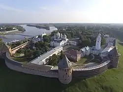 Historické památky Velikého Novgorodu a okolí | Novgorod byl v 9. století prvním hlavním městem Kyjevské Rusi a od 12. do 15. století hlavním městem Novgorodské republiky. Díky své poloze na křižovatce obchodních cest spojujících Severní Evropu se Střední Asií a Byzantskou říší, se město stalo jedním z nejvýznamnějších center ruského umění a kultury a také duchovní centrum. Většina dochovaných památek ve městě, jako chrámy a kláštery, jsou z doby Novgorodské republiky. Na snímku je kreml.[12] | Federální okruh: Severozápadní federální subjekt: Novgorodská oblast město: Veliký Novgorod |