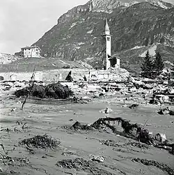 | 1963 | Řeka Vajont | Sesuv | (260 m) | 1 917 | ![]() ![]() 9. října 1963 v 22:39 místního času se jižního úbočí Monte Toc v délce 2 km sesunulo rychlostí 110 km/h. Objem uvolněné hmoty se odhaduje na 260 milionů m³, což je víc než objem samotného přehradního jezera. Vzniklo megatsunami vysoké 260 m, které se vydalo, jak proti proudu, tak směrem po proudu. Zhruba 50 milionů kubíků se přelilo přes hráz přehrady Vajont. Pod ní vyhloubilo při dopadu kráter široký 80 m a hluboký 60 m. Masa vody téměř úplně zničila nic netušící město Longarone. Povodňová vlna rovněž zasáhla i sousední města jako Pirago, Rivalta, Villanova a Faè. Celkem zahynulo zhruba 2 tisíce osob. Statika hráze zůstala netknutá, ačkoliv došlo k odplavení metru její koruny. Longarone a další vesnice v údolí řeky Piavy byly přestavěny. |