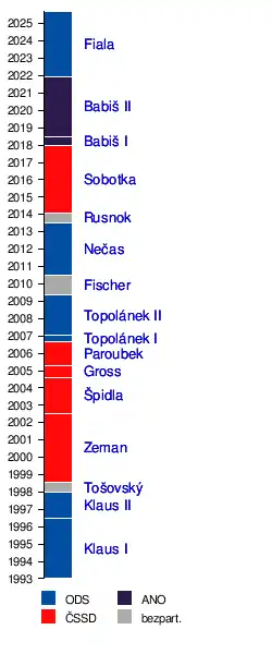 | 1. | první vláda Václava Klause | 2. 7. 1992 – 4. 7. 1996 | 1463 | 19 | 106/200 | volby do PS PČR 1996 | ODS, KDS, ODA, KDU-ČSL | |