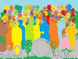Ve finální podobě je na titulním obrázku barevná koláž vytvořená z lepenkových modelů rozličných slavných osobností, mezi kterými je Edgar Allan Poe, Fred Astaire, Bob Dylan, Tony Curtis, Marilyn Monroe, Oliver Hardy, Karel Marx, Sigmund Freud, Stuart Sutcliffe, Oscar Wilde, David Livingstone, Johnny Weissmuller, George Bernard Shaw, Aleister Crowley, T. E. Lawrence, Marlon Brando, Lewis Carroll, Shirley Temple, Albert Einstein, Marlene Dietrich nebo voskové figuríny samotných Beatles v oblecích (z muzea Madame Tussaud) – uprostřed pak „živí“ Beatles v uniformách Sgt. Peppera. Figuríny jsou nastaveny tak, aby se dívaly dolů na nápis The Beatles, který je vytvořen z květů. Ve skupině postav měli být i Ježíš Kristus, Adolf Hitler nebo Elvis Presley, ale byli zamítnuti. Harrisonem navrženého Gándhího nařídilo vyřadit vedení EMI kvůli případným problémům ze strany indických fanoušků. Část hlavy (na schématu č. 54A) v levé části mezi boxerem Sonny Listonem a figurínou George Harrisona nebyla nikdy identifikována.