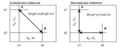 Manhattanská vzdálenost, známá také jako L1 norma, měří vzdálenost jako součet absolutních rozdílů mezi souřadnicemi. Používá se v případech, kdy se předpokládá pohyb pouze ve vertikálním nebo horizontálním směru: [6]
