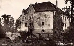 Již záhy po okupaci byl v srpnu 1939 na Úřadu říšského protektora předložen návrh na zřízení výcvikového prostoru zbraní SS Čechy.[50] Celá rodina nájemce statků Artura Peška byla v březnu 1942[51] odvlečena do Osvětimi, kde většina jejích členů zahynula. Obec Vrchotovy Janovice ležela v jižní části plánovaného prostoru a měla být vyklizena v poslední, páté etapě. Sidonie Nádherná se snažila tomuto aktu zabránit všemožnými, často naivními cestami. Poukazovala především na památkovou hodnotu zámku. V tom jí pomáhal úředník památkového úřadu Václav Wagner, se kterým se sblížila.[52] Dne 3. července 1943 bylo ale vyhlášeno vyklizení Janovic. Sidonii Nádherné bylo nicméně dovoleno odvézt si vybavení zámku.[53] Na jaře 1944 se odstěhovala do pronajaté místnosti na statku ve Voračicích. Mobiliář zámku byl uskladněn v nedaleké stodole. Zámek byl předán vysidlovací kanceláři 28. března 1944. V obci byla zřízena opravna tanků a pobočka koncentračního tábora Flossenbürg. Konec druhé světové války se ale nezadržitelně blížil a v noci z 8. na 9. května uprchli z Janovic poslední příslušníci SS.[54]