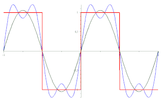 Animované srovnání aproximace čtvercového signáluFourierovou řadou a sigma aproximací sigma (zeleně - špatně viditelné). Je vidět, že při aproximaci Fourierovou řadou se v okolí diskontinuit projevuje Gibbsův jev, zatímco σ-aproximace konverguje hladce.