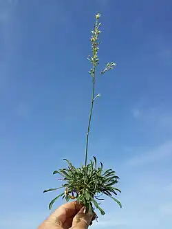 Vytrvalá nebo víceletá, zřídka dvouletá rostlina, vysoká 20 až 60 cm, ojediněle i přes 1 m, která roste v trsech. Z dlouhého, ztluštělého, málo dřevnatícího, chudě větveného kořene vyrůstá jedna nebo více lodyh s listy stěsnanými do husté, přízemní růžice. Listy v růžici vyrůstají vstřícně, jsou jednoduché, celistvé, bývají dlouhé 25 až 100 mm a široké 8 až 15 mm, mají kopisťovitý, lopatkovitý tvar se široce zaobleným koncem, někdy jsou okrouhlé a mělce vykrojené a horní bývají kornoutovitě svinuté. Lodyha je přímá, oblá, tenká ale tuhá, až ku květenství nevětvená, ve spodní části chlupatá a v horní lysá a lepivá, její málo početné střídavé listy jsou přisedlé, drobné, obkopinaté a úzké.