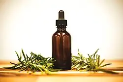 Lahvička s esenciálním olejem z rozmarýnu a rozmarýnové listy