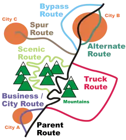 - Podjezdova trasa je obvykle přístupová trasa, která se rozděluje od hlavní trasy k důležitému geografickému bodu, jako je město, letiště, park atd. Na sousedním obrázku to lze přirovnat k obchvatové trase.