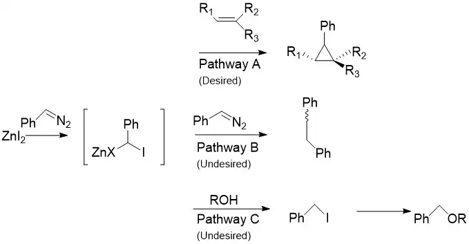 Působením steichiometrických množství zinečnatých halogenidů se vytváří organozinkové sloučeniny podobné výše zmíněným karbenoidům. Tyto sloučeniny mohou reagovat s téměř všemi alkeny a alkyny, včetně styrenů a nenasycených alkoholů; při běžných Simmonsových-Smithových reakcích jsou alkoholy deprotonovány. Zapojit se ovšem mohou i do reakcí s výchozími diazosloučeninami, kde vzniká cis- nebo trans- 1,2-difenylethen. Meziprodukt může navíc reagovat s alkoholy na jodfenylmethan, který poté vstupuje do SN2 reakce za vzniku ROCHPh.