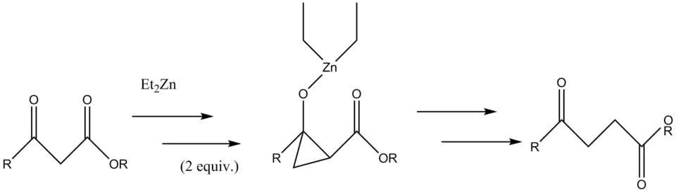 Furukawovaobměna Simmonsovy-Smithovy reakce může sloužit k tvorbě cyklopropanových reaktivních meziproduktů v rámci přípravy γ-ketoesterů z β-ketoesterů. Simmonsovo-Smithovo činidlo se nejprve naváže na karbonylovou skupinu vedle α-uhlíku pseudoenolu. Následně se z takto vzniklého meziproduktu vytvoří cyklopropylová sloučenina, která se rychle rozkládá na výsledný produkt.[32][33]
