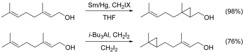 Specifita těchto činidel umožňuje navazování cyklopropanových skupin do polynenasycených struktur, které se s použitím zinkových činidel cyklopropanují úplně a neselektivně, například i-Bu3Al cyklopropanuje geraniol do polohy 6, zatímco Sm/Hg do polohy 2, jak je zobrazeno na následujícím obrázku.