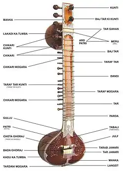 - tabali (tabkhandi) vypouklá rezonanční deska nástroje, většinou z tunu (Cedrela tuna) nebo z teaku