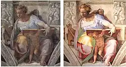 Restaurování Michelangelových fresek Fresky Sixtinské kaple utrpěly vodou, kouřem ze svíček i předchozími neodbornými opravami, takže se mnozí domnívali, že je Michelangelo namaloval v tlumených, temnějších barvách. V letech 1980–1994 proběhly práce, vedené vatikánskými restaurátorskými ateliéry: začaly průzkumem s použitím infračervené fotografie, pokračovaly spektrální analýzy vzorků sejmutých barevných vrstev (tzv. nábrusů), od roku 1982 restaurátoři s podporou japonské televize Nippon TV (NTV) zahájili záchranu maleb. Nejprve zajistili opadávající částečky pomocí přelepů. Povrch omyli destilovanou vodou s přesně dávkovanými rozpouštědly a pak opakovaně čistou destilovanou vodou, následně v místech trhlin v omítce použili nutné vytmelení a retuše barevných vrstev. Závěrem použili konzervační lak pro ochranu před dalším znečištěním. Tlumená barevnost postav a tmavé tóny se proměnily na původní výrazné: světlou barvu pokožky, zářivé vlasy a šaty jasných barev.