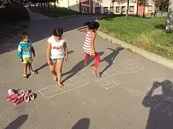 Navíc si úlohu mohou znesnadnit vhozením kamene či jiného malého předmětu před každým kolem ze startovní čáry na postupně se zvyšující čísla (a pole) na postavě. V daném kole pak kámen s obrazcem musí přeskočit bez dotyku obsazeného pole.