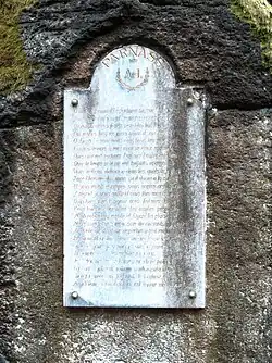 Verše byly původně vysekány do skály, kde je dosud patrná plocha opracovaná pro jejich text. V hrubozrnné žule se čitelnost textu časem ztratila. Proto byla báseň vyryta zlacenými písmeny do mramorové desky vsazené do rozměrnější plochy původního nápisu. Tehdy došlo v přepisu titulu básně k záměně špatně čitelného písmena „F“ za „I“. Vysvětlení našel karlovarský historik Stanislav Burachovič v knize Karlsbad im Munde seiner Gäste z roku 1932.[1]