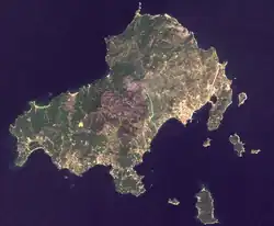 Ostrov je asi 12 kilometrů dlouhý a 6 kilometrů široký. Pobřeží je členité se zálivy, mysy a poloostrovy. Jihovýchodní a jihozápadní části mají mírnější svahy, a tam se také nachází většina osad a zařízení. Terén je více hornatý na severním pobřeží, s nejvyšším vrcholem 433 m na hoře Karafiltzanaka.