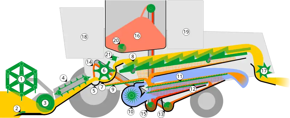 Kombajn obilí poseče žací lištou, která jej průběžným dopravníkem dopraví do středu lišty před šikmý řetězový dopravník a ten jej posune do mláticího ústrojí, kde se oddělí zrno od slámy a plev (tedy provádí mlácení). Hrubé omlaty (zrno, části stonku a plevy) putují na sítovou skříň, která pomocí vibrací a toku vzduchu zrno vyčistí. Vyčištěné zrno následně dopraví zrnový výtah do zásobníku zrna, který se po naplnění vysype do odvozního prostředku (souběžně jedoucího) vozu (nákladního auta nebo přívěsu traktoru). Sláma je z mláticího ústrojí uložena do řádku či rozdrcena drtičem a rozhozena do šířky záběru mlátičky.