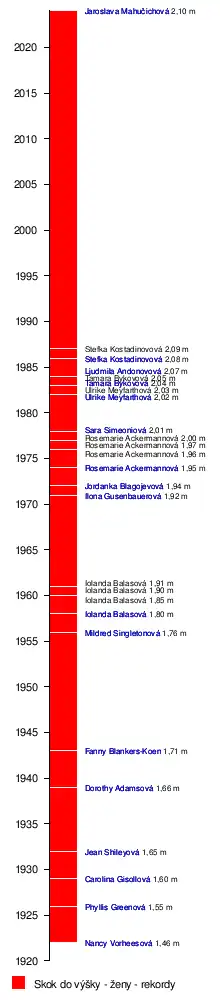 U žen je brána jako magická hranice výška 200 cm, přes tuto výšku se však dostalo v celé historii již zhruba 40 žen. Jako první Němka Rosemarie Ackermannová 26. srpna 1977 v Berlíně. Světový i evropský rekord vytvořila 7. července 2024 Ukrajinka Jaroslava Mahučichová, když na pařížské Diamantové lize překonala laťku ve výšce 210 cm. Překonala tak 37 let starý rekord Stefky Kostadinovové z Mistrovství světa 1987. Hranici 206 cm zdolalo k roku 2024 celkově deset výškařek. Výšku 205 cm poté měly skočeno Tamara Bykovová, Heike Henkelová, Inga Babakovová, Tia Hellebautová a Chaunté Loweová.