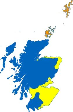 Mapy skotských jazyků na základě sčítání lidu v roce 2011:a) mapa skotské gaelštiny