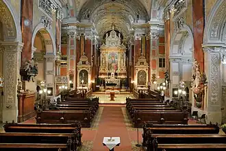 Původně románská trojlodní bazilika s kryptou byla přestavěna v raně barokním slohu po zásahu blesku z roku 1638 , kdy se zřítila věž kostela a byl poškozen krov. Přestavbu kostela projektovali a realizovali Andrea Allio starší († po 1652), jeho příbuzný Andrea Allio mladší a Silvestro Carlone. Redukovali délku kostela, takže věž není spojena s kostelní lodí. Kamenické práce provedl císařský dvorní sochař a kameník Peter Concorz (1605–1658), povolaný z bavorského Freyungu. Opat Michael II. Schnabel koupil kámen na výrobu kříže z císařského kamenolomu. V roce 1651 dvorní kamenický mistr Bartolomäus Khöll vytesal hlavní portál v průčelí věže. Sochař Adam Tobias Kracker z Vídně vložil do niky sochu Panny Marie s děťátkem. Tři oltářní obrazy dodal malíř Joachim von Sandrart: na oltář apoštolů (1652), Svatého Kříže (1654) Nebeskou Glorii na hlavní oltář (1671). Tobias Pock namaloval oltářní obrazy sv. Šebestiána (1649/1650), pro Mariánský oltář (1651/1655) a oltář sv. Benedikta (1654). Koncem 20. století byla znovu odkryta jeho freska sv. Wolfganga namalovaná kolem roku 1655. Oltářní obraz sv. Řehoře Velikého namaloval Georg Bachmann (1651/1652). Autorství obrazů na oltářích sv. Anny a sv. Barbory (oba z let 1656-1659) bylo připsáno malíři Jeronimu Joachimovi. Freska pod klenbou kruchty představuje založení kláštera a udělení privilegií.