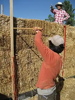 Stavění ze slámy se obvykle skládá z navršení balíků slámy (často v pásech) na vyvýšeném základu nebo na základovém pasu s parotěsnou zábranou nebo jinou zábranou proti vzlínání vlhkosti umístěnou mezi balíky a základy.[11] Stěny z balíků mohou být připevněny k sobě tyčemi z bambusu, betonářskou výztuží, nebo dřevem (uvnitř balíků nebo na jejich povrchu), nebo pomocí drátěného pletiva, a pak omítnuty nebo chráněny sádrou, či cementem,vápennou nebo hliněnou omítkou. Balíky mohou plnit funkci nosné (zeď), tak jak to bylo v případě originálních staveb z konce 19. století.