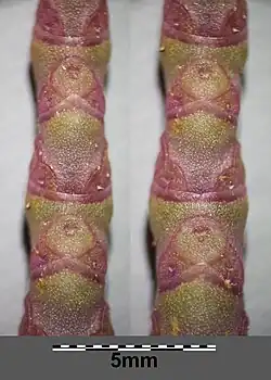Listy jsou patrné pouze jako objímavý lem na horních koncích lodyžních článků se dvěma vstřícnými špičkami. Květy jsou oboupohlavné, jsou vnořené do pletiva horních šesti až deseti zkrácených, květonosných článků na konci lodyhy či větví, tyto články s květy vytvářejí květenství lichoklas. Na každém článku lichoklasu jsou ve vstřícném postavení dvě drobná květenství obsahující po třech květech, z nichž je střední větší než oba krajní. Symetrický květ má zelené, dužnaté okvětí srostlé téměř k vrcholu a otvírající se štěrbinou pouze v době kvetení. Z květu přes ní vyčnívají jedna až dvě tyčinky s prašníky a dvě pérové blizny.