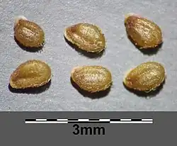 Z květu anemogamicky opyleného se vyvine plod, vejčitá nažka s blanitým oplodím. Obsahuje jedno, eliptické, asi 1 mm dlouhé, světle hnědé semeno s chlupatým povrchem, jenž neobsahuje výživné pletivo endosperm. Semena občas bývají nestejně velká.[1][2][6][7][9][10]